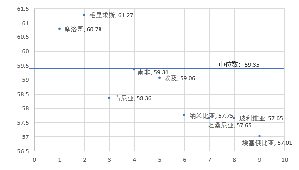 我们对全球102个国家和地区的出境游客服务质量按季度进行监测,这里选取九个非洲国家进行比较,分别是毛里求斯、摩洛哥、南非、埃及、肯尼亚、纳米比亚、玻利维亚、坦桑尼亚和埃塞俄比亚。从数据分析结果看,赴非游客认为非洲各目的地国家的居民普遍友好,而目的地公共服务均明显不足。评价模型中的各项指标采用百分制,图3为今年1-3季度我国居民赴非旅游服务质量评价结果,中间的蓝线是中位数线,59.35为中位数。除了毛里求斯和摩洛哥外,其余七个国家在中位线的下面,说明赴非游客对上述目的地的综合满意度比较低的,属于偏下的满意程度。